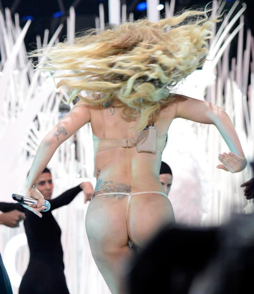 Kuukausien tauon jälkeen Lady Gaga nähtiin eilen esiintymässä MTV Music Video Awards -gaalassa. Supertähti lunasti odotukset näyttävästä esiintymisestä, ja niukka esiintymisasu paljasti enemmän kuin peitti. Laulaja nimittäin esiintyi bikineissä, joiden alaosana nähtiin stringit.