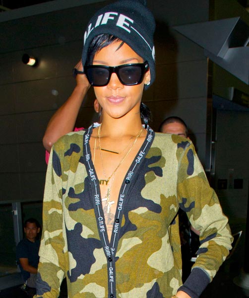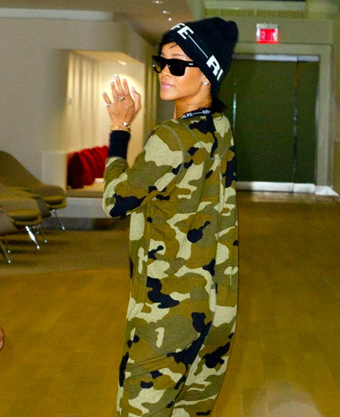 Nyt Rihanna on kuitenkin kuvattu toisenlaisissa, enemmän tähden imagoon sopivissa merkeissä. Tähti nähtiin New Yorkin JFK-lentokentällä koko vartalon peittävässä, maastonvärisessä haalarissa. Tyylilleen uskollisesti tähti kuitenkin piti erikoisen vaatekappaleen edessä olevaa vetoketjua varsin alhaalla, paljastaen etteivät rintaliivit kuuluneet hänen varustukseensa tälläkään kertaa.