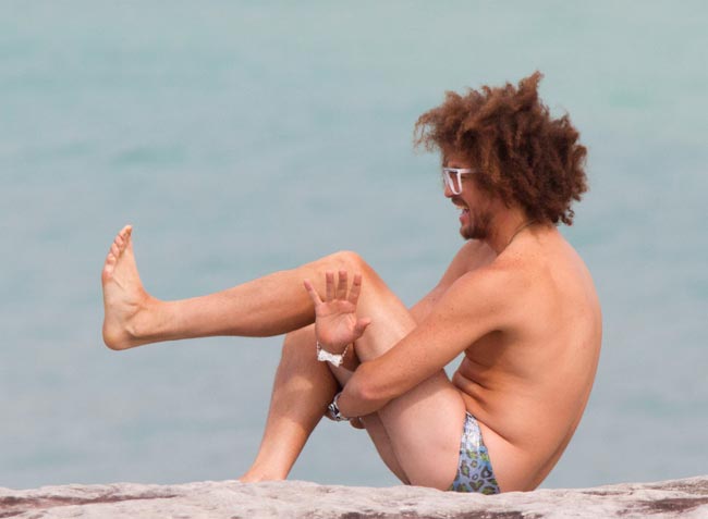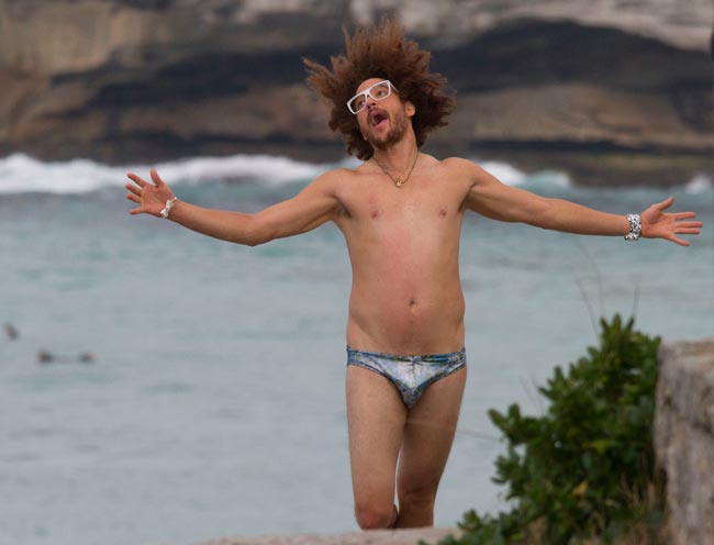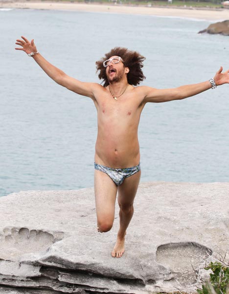 Redfoo onnistui antamaan paparazzeille kuvattavaa temppuilemalla koomisen näköisissä asennoissa rannalla. Yllään miehellä oli pelkät alushousut. Mies kuvasi mitä ilmeisimmin samaan aikaan La Freak -vaatemallistonsa mainoskuvia.