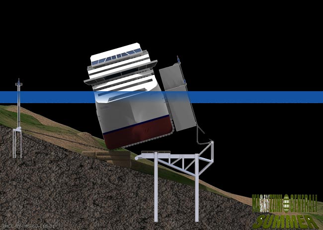 Oheisista kuvista selviää, että laivan alapuolelle on määrä rakentaa eräänlainen teline, johon laiva yritetään kaataa painojen avulla. Kun laiva saadaan pystyasentoon ja telineen päälle, sitä on määrä nostaa niin paljon, että se nousee kellumaan. Sitten laiva voidaan hinata esimerkiksi telakalle.