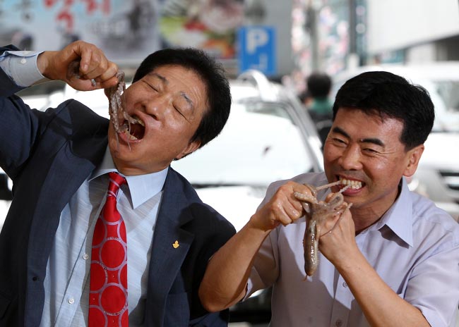 Yhdysvalloissa järjestetään runsaasti syömiskilpailuja, mutta tuskin aivan tällaisia. Soulissa nimittäin ahmimisen kohteena oli suuri joukko mustekaloja, ja lisää vaikeusastetta tehtävään toi se, että mustekalat olivat syömisvaiheessa vielä eläviä.