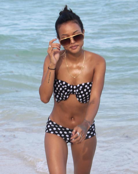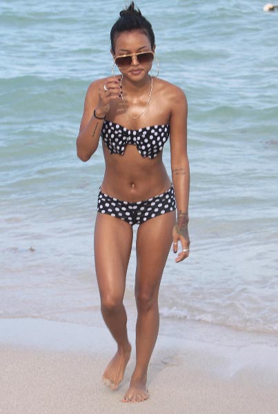 Karrueche Tran on parhaillaan viettämässä Chris Brownin kanssa lomaa aurinkoisessa Miamissa. Rantaelämästä nauttinut pariskunta ikuistettiin kuviin, joista ilmenee etteivät 25-vuotiaan mallikaunottaren pilkulliset bikinit peitelleet liikoja.
