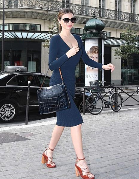 Victoria’s Secret -alusvaatefirman kanssa työt aiemmin lopettanut Miranda on itsestäänselvä näky Pariisin muotiviikoilla. Neito ehti myös nauttia romantiikan kaupungista pienellä shoppailureissulla. Hänen tummassa mekossaan oli tyyliä, mutta asu oli samalla viettelevä avonaisen kaula-aukkonsa ansiosta.