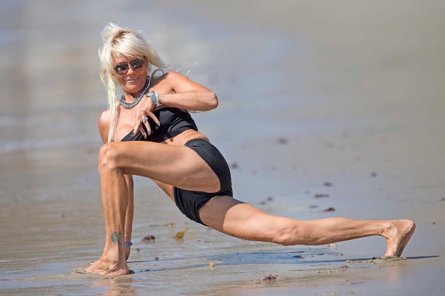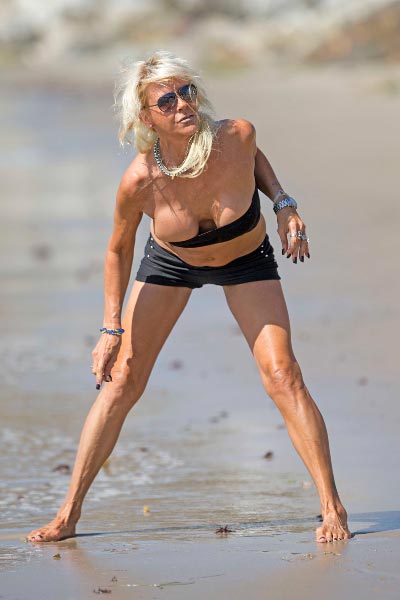 Laulu-uraa It’s Tan Mom -kappaleen ja musiikkivideon voimin yrittänyt perheenäiti on nyt kuvattu venyttelemässä jooga-hetkenään Los Angelesissa sijaitsevalla uimarannalla. Naisen asennot ja asu olivat mielenkiintoiset, ja rinta olikin pullahtaa topista.