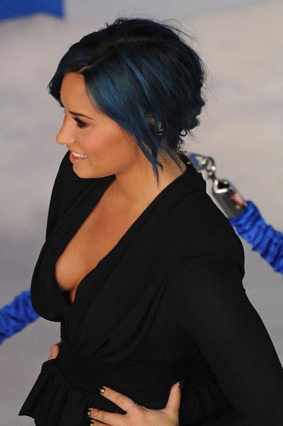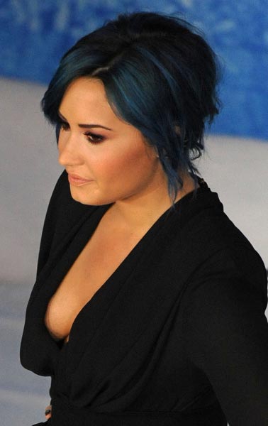 21-vuotias näyttelijäkaunotar osallistui Los Angelesin El Capitan -teatterissa järjestettyyn Frozen-elokuvan ensi-iltaan. Hiuksensa sinisiksi värjänneellä Demi Lovaton mustan paidan avonainen kaula-aukko tarjosi varsin peittelemättömän näkymän tähden näyttäviin muotoihin.
