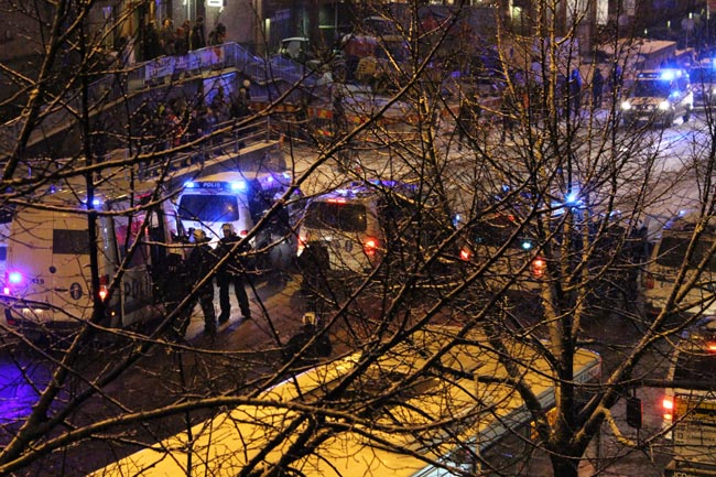 Tällä hetkellä mellakoitsijat ovat päässeet keskustan puolelle lukuisten poliisipartioiden seuratessa perässä. Silmämääräisesti arvioituna mellakkaa rauhoittaa tällä hetkellä toistakymmentä poliisipartiota.