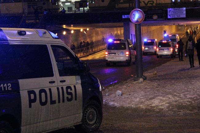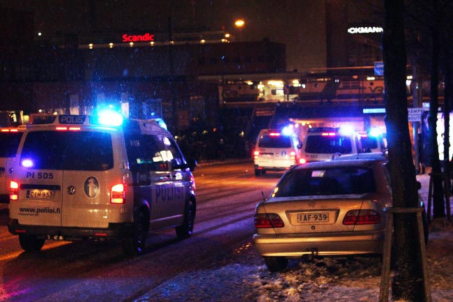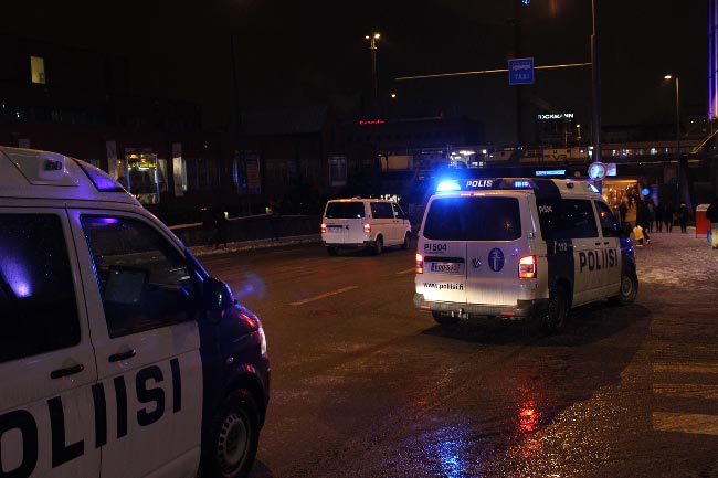 Muutaman minuutin häiriköinnin jälkeen läheiseltä Tampere-talolta saapui paikalle suuri määrä poliisiautoja, jotka asemoituivat koko Itsenäisyydenkadun leveydeltä mielenosoittajien ympärille. Tämän jälkeen poliisiautot lähtivät hitaaasti liikkumaan kohti keskustaan johtavaa tunnelia, jonne mielenosoittajat siirrettiin. Samaan aikaan mielenosoittajat ampuivat edelleen ilmaan ilotulitteita.