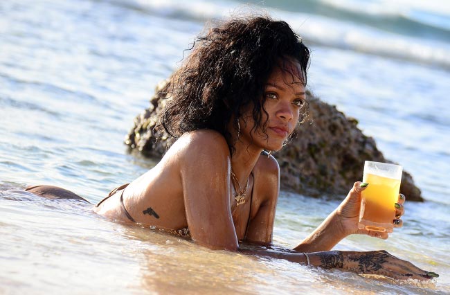 Joulun alla Rihanna kuvattiin niin sanotuissa mummobikineissä, eli erittäin korkeassa alaosassa. Eilen bileprinsessa suuntasi jälleen One Sandy Lane Beachin rannalle, mutta nyt bikinit olivat vaihtuneet nykyaikaisempiin. Rihanna makoili rantavedessä takamus pinnalla ja hieroi itseensä mutaa.