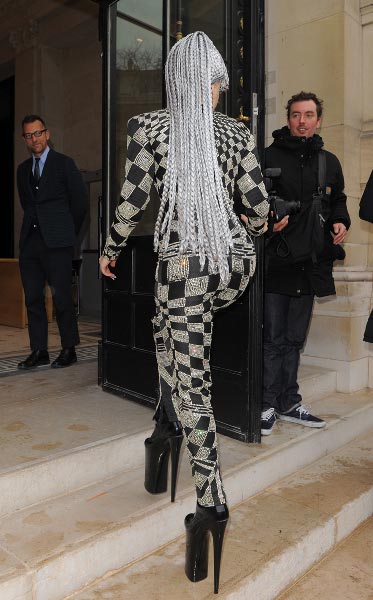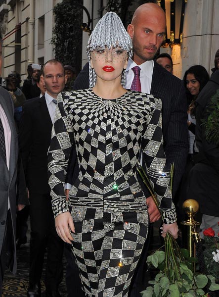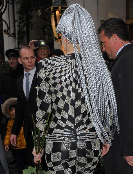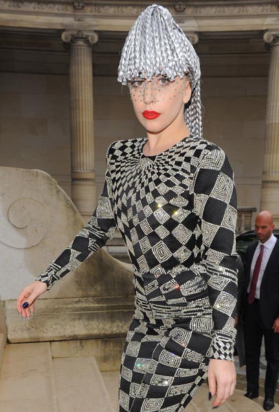 27-vuotias Lady Gaga osallistui Pariisissa Azzedine Alaian muotinäytökseen. Naisen yllä oli mustavalkoinen vartalon peittävä asu, hurjan korkeat korot ja mauton hopeinen lettiperuukki. Poptähteä ei voisi hyvällä tahdollakaan sanoa tyylikkääksi, vaikka hän oli varsin näyttävä ilmestys paparazzien mielestä.