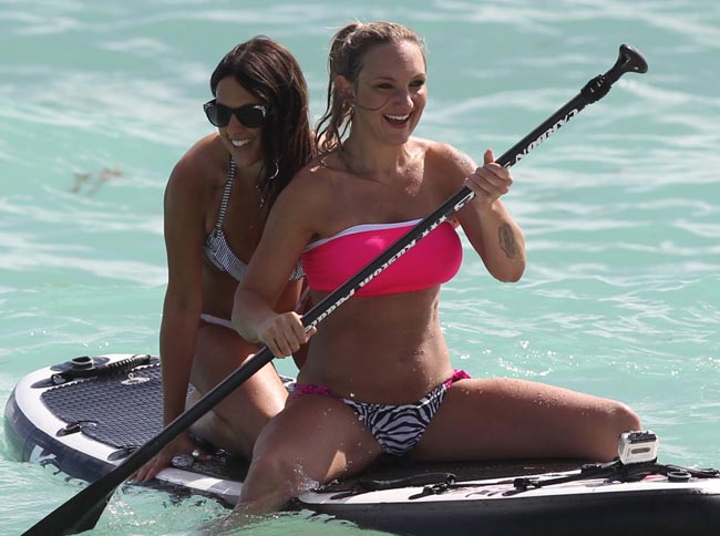 Tällä kertaa Claudia on kuvattu tanskalaisen televisiotähti Stine Kronborgin kanssa rannalla, jossa molemmat ilakoivat näyttävästi surffilaudalla meloen.