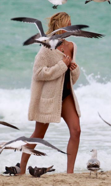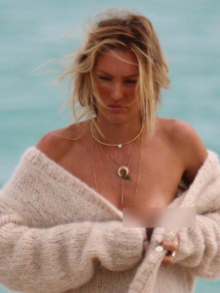 Candice oli kuvauksissa Miamissa sijaitsevalla rannalla, kun hän peitti muuten paljaan ylävartalonsa pelkällä takilla. Löysä takki kuitenkin petti yllättäen, ja supermallin rinta pullahti näkyviin. Takki paljasti myös alavartaloa, joka oli onneksi peitetty bikinien alaosalla.