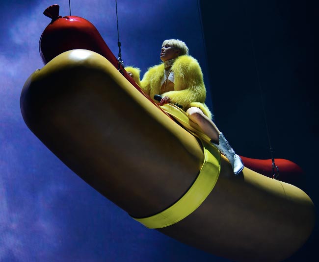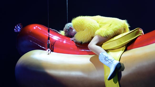 Cyrusin eilisiltainen Bangerz Tour -kiertueen avauskonsertti Kanadan Vancouverissa lunasti odotukset, sillä laulaja esiintyi paljastavissa asuissa ja muun muassa lensi ilmassa provokatiivisesti valtava hotdog jalkojensa välissä.