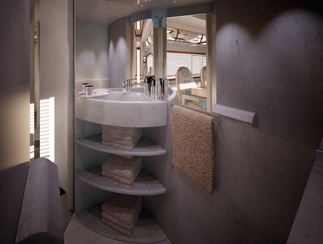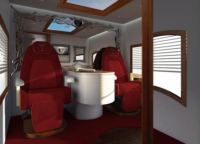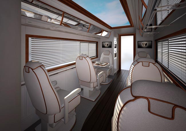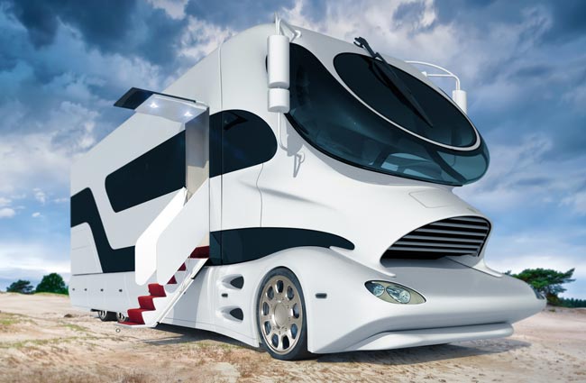 Marchi Mobilen tuorein malli maksaa Yhdysvalloissa 1,3 miljoonaa dollaria. Se sisältää kaksi kerrosta, joista ylempi on kattolounge ja alempana ovat varsinaiset asuintilat. Nekin ovat tosin kooltaan ja tyyliltään hieman jotain muuta kuin Suomessa myytävissä ajopeleissä. Naapureiden kestitystä varten asuntoautossa on tietenkin myös grilli ja kaksimetrinen pöytä. Ja yhteensä kahdeksan televisiota.