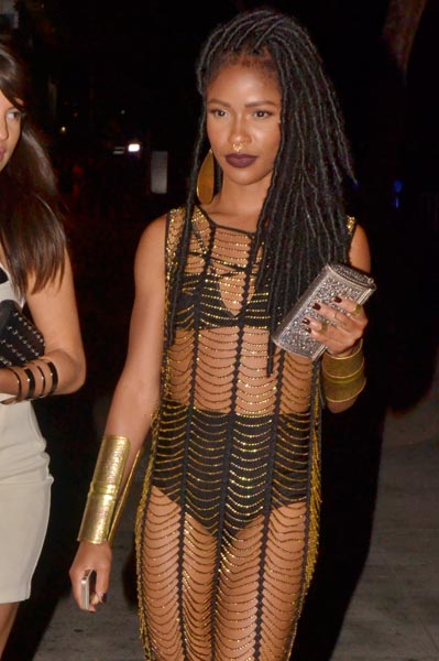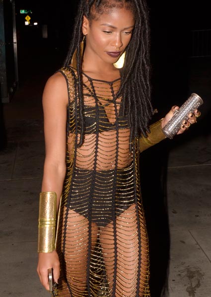 Simone Battle saapui Pacific Design Centerissä järjestettyyn gaalaan puolialastomana, sillä alusvaatteiden päällä oli ainoastaan muutamasta narunpätkästä muodostunut rakennelma.