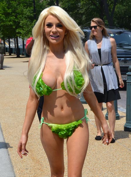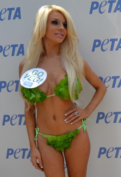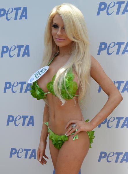 Nyt kohublondi on palannut julkisuuteen, kun hän osallistui PETA-eläinsuojelujärjestön tilaisuuteen. Courtney oli ahtanut muhkeat silikonirintansa salaatinlehtiä muistuttaviin luomuhenkisiin bikineihin, kun hän vastusti lihansyöntiä.