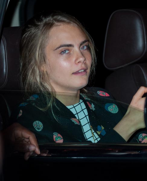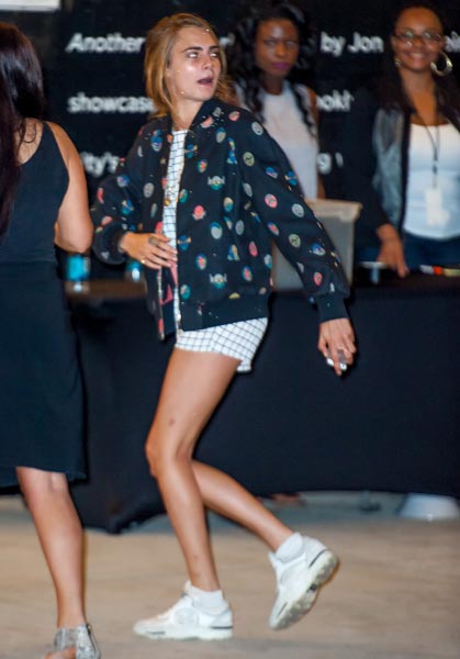 Julkkiskaverusten juhliminen taisi mennä melko pitkäksi, sillä pian sen jälkeen Cara kuvattiin saapumassa New Yorkin Barclays Centerissä järjestettyyn hyväntekeväisyysotteluun melko juhlineen näköisenä. Samalla kaunotar osoitti, että myös supermalleilla on huonot päivänsä.