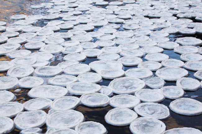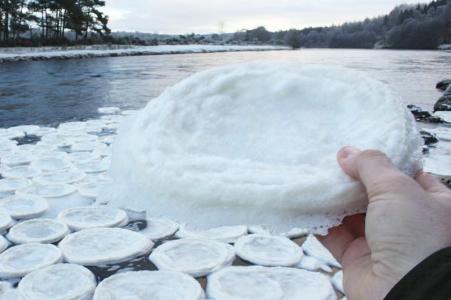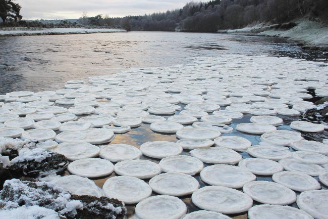 The River Dee Trust -säätiön jäseniä odotti äskettäin erikoinen näky Skotlannissa sijaitsevalla River Dee -joella. Jäätyneen veden pinnalle oli nimittäin ilmestynyt suuri määrä noin lautasen kokoisia jääkiekkoja, joita paikalliset kutsuvat ”jääohukaisiksi” pyöreän muodon vuoksi.