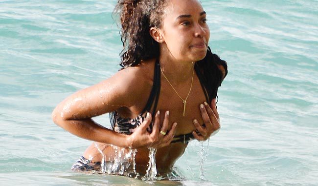 22-vuotias Leigh-Anne on viettänyt joulun ja uudenvuoden Barbadoksella yhdessä poikaystävänsä Jordan Kiffin kanssa. Eilen rantaveteen pulahtaminen ei mennyt ihan suunnitelmien mukaan, sillä aalto oli viedä mukanaan kaunottaren bikinit. Hän onnistui kuitenkin viime tingassa estämään muotojensa paljastumisen.