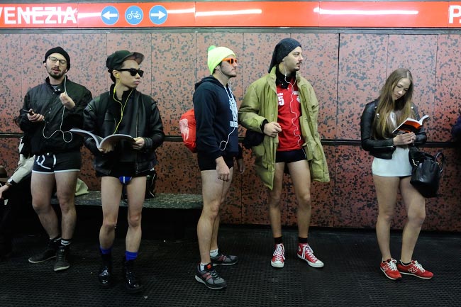 Ympäri maailmaa yli 60 kaupungissa järjestettävässä tempauksessa ihmiset riisuvat sovittuun aikaan housunsa samanaikaisesti jossain julkisen liikenteen kulkuvälineessä. Näissä kuvissa nähdään millaisen näyn kohtasivat Milanon metromatkustajat yllättäen sunnuntaina. Näkemäänsä ihmetteleville sivullisille riisujat kertoivat unohtaneensa pukea housut jalkaansa.