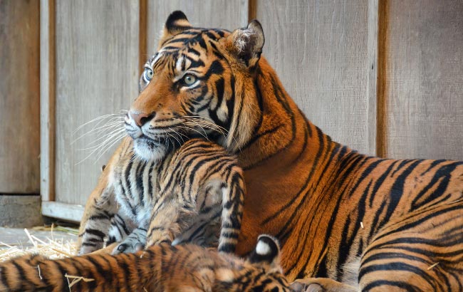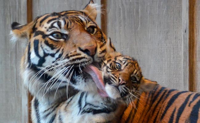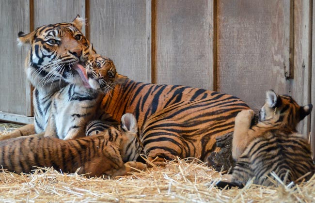 Point Defiance Zoo & Aquarium -eläintarhan uumenissa syntyivät 8. lokakuuta sumatrantiikerit Kirana, Indah ja Dari. Nyt niiden emo Jaya on kuvattu hoivaamassa pienokaisiaan aitauksessaan. Kuvaaajan mukaan tiikerit leikkitaistelivat emonsa kanssa, kun kuvia ikuistettiin.