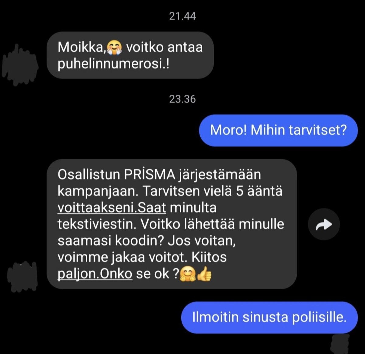 Tämän jälkeen huijari esittää kaapatun profiilin henkilöä ja kertoo pyrkivänsä saamaan voiton esimerkiksi arvonnassa. Siihen tarkoitukseen hän tarvitsee puhelinnumeron, johon on hetken kuluttua tulossa numerokoodi. Moni suomalainen lankeaa tällaiseen ansaan, koska viesti näyttää tulevan omalta perheenjäseneltä tai hyvältä ystävältä.