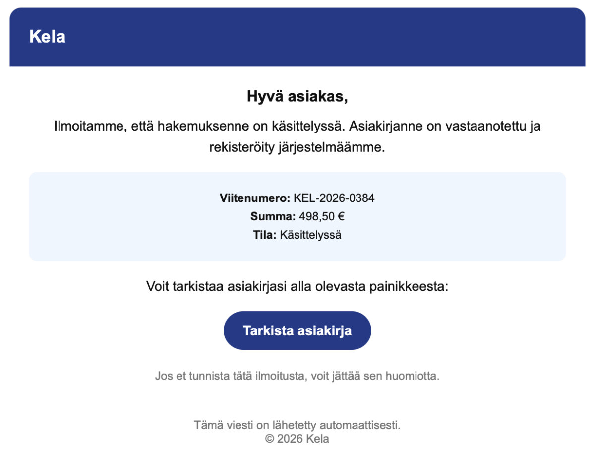 – Hyvä asiakas. Ilmoitamme, että hakemuksenne on käsittelyssä. Asiakirjanne on vastaanotettu ja rekisteröity järjestelmäämme. Viitenumero: KEL-2026-0384. Summa: 498,50 €. Tila: Käsittelyssä. Voit tarkistaa asiakirjasi alla olevasta painikkeesta, viestissä todetaan.