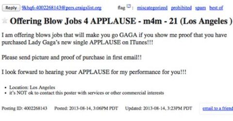 Viihdeuutiset 16.8.2013, 7:00 Lady Gaga floppaamassa – suuseksiä singlen ostajille Poptähti Lady Gaga julkaisi aiemmin tällä viikolla uuden Applause-nimisen singlensä, Facebook Twitter Sähköposti Whatsapp